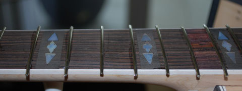 Durch die Notwendigkeit einer Inlayerneuerung an der Kopfplatte und einer Neubundierung mit Griffbrettkorrektur durfte ich daran Teil haben.