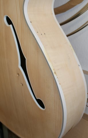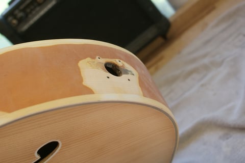 Anschließend habe ich noch die Kopfplatte für die neuen Tuner vorbereitet und die Löcher an der Decke verschlossen und retuschiert. An zwei Stellen musste das Binding nachgearbeitet und ein Stück eingesetzt werden da es einfach zu dünn bzw. verunreinigt war.