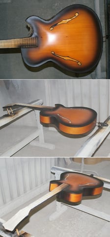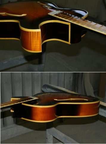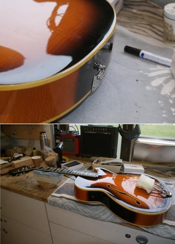 An der Lackierung wurde bereits rumgebastelt. Stellenweise so unsauber und unprofessionell das wir uns zu einer Neulackierung entschlossen haben. Was sich später als gute Entscheidung herausstellen sollte. Teilweise wurde über die Polyesterlackierung, z. B. auf dem Top und Teilbereichen der Zargen, Nitrolack aufgetragen. Dadurch war extrem viel Lack auf der Gitarre. Das Burst war farblich an sich schön aber eben nicht akkurat an den Bindings versäubert. Teilweise hatten die Bindings Flecken und waren sehr stark verschliffen. Auf den folgenden Bildern sehr gut zu sehen.