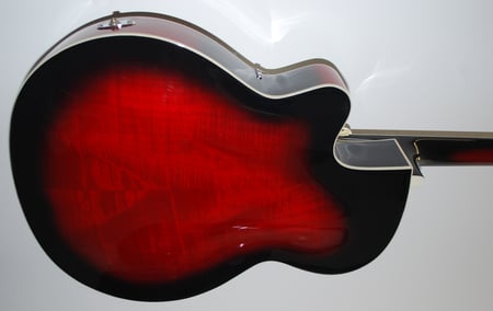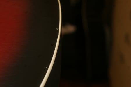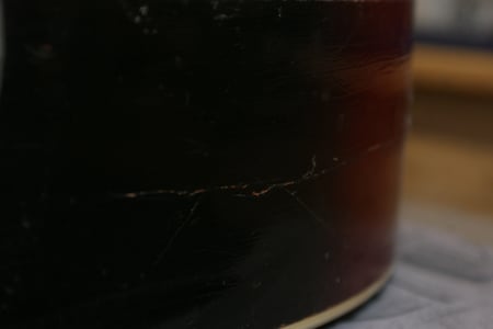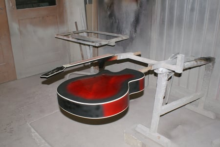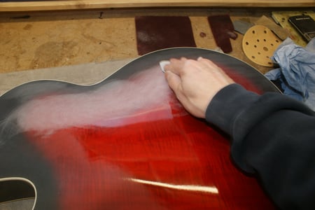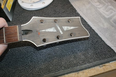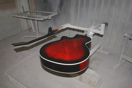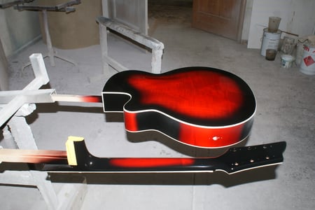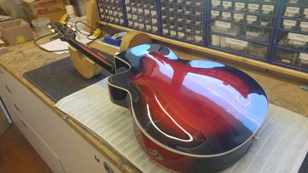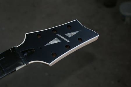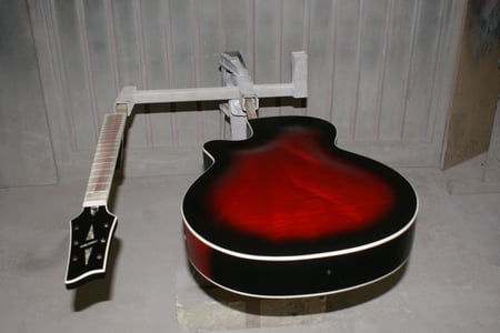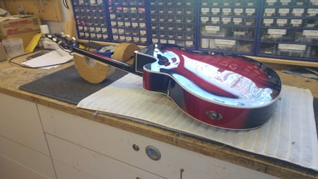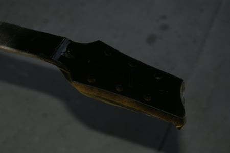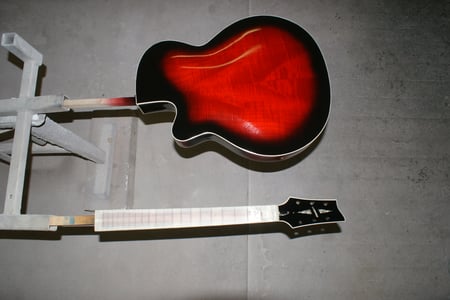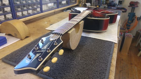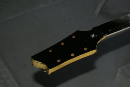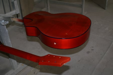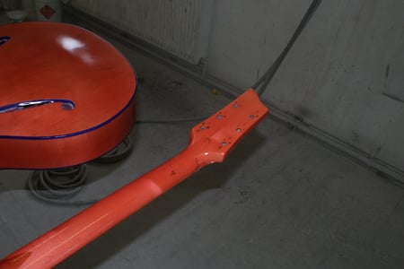Die Beschädigungen am Korpus und dem Hals machten eine Neulackierung unumgänglich. Selbstverständlich wurde mit