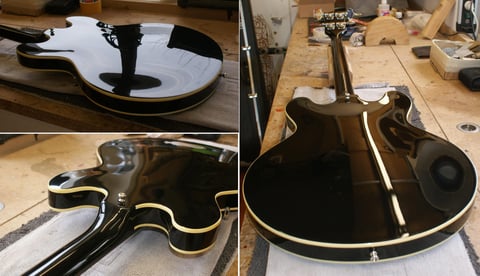 Das Instrument wurde irgendwann von jemanden in Gold umlackiert. Leider nicht vom Profi denn da wurde mehr ruiniert wie verschönert. Leider wurden bei diesem Instrument die F-Holes beim Lackiervorgang nicht abgedeckt und so war der gesamte Lack auch im Inneren des Instrumentes. Mit eigenst zurechtgemachten Ziehklingen konnte ein Teil wieder entfernt werden.